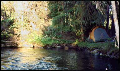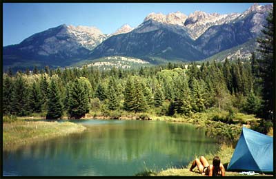 Relaxing at our river-side camp below the towering Rocky Mountains Click the photo to view a full size image |