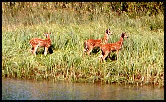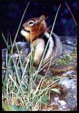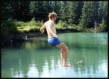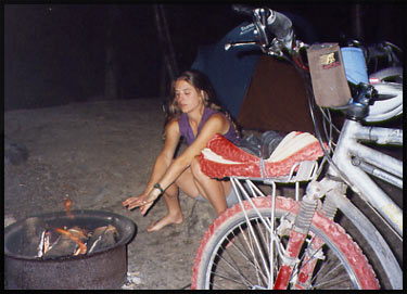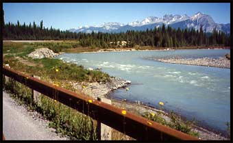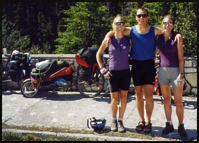 We made camp that evening at the Marble Canyon Campsite, about 10 km's from the top of the Vermilion Pass. Along the way we met a group of three cyclists on their way down the pass - two German fellows on a Santana tandem pulling a Bob-trailer, and a girl, Catherine, travelling with them for part of the journey. We chatted with them for a while, and found out that Martin and Bernhard would be passing through Vancouver later in August. They were on a journey from Anchorage, Alaska to Death Valley, California. We invited them to visit us, which they did (they camped on the lawn for a couple nights), then met up with them again in Hollywood when we were there for a trade show in September. |