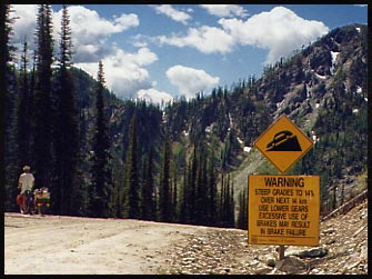 Gray Creek Pass. "Warning: Steep grades to 14% over next 14 km. Use lower gears. Excessive use of brakes may result in brake failure" |