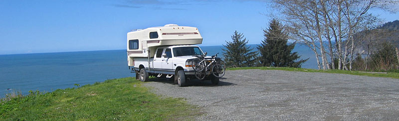 For us seasoned backpackers, bike trippers and all-round self-propelled adventurers, this is the ultimate in luxury vacationing: Full queen size bed (over cab), large dinette (turns into a double bed), 3-piece bathroom (toilet, sink, shower), good sized sink, 3-burner gas stove, oven (!!), fridge with freezer, furnace, stereo, 35 gallon water storage plus 5 gallon hot water tank (for those hot showers!), plenty of lights and almost more cabinets, closets, drawers and hidden compartments than you know what to do with. End up with 11 pairs of shoes on your trip? No problem! (Don't ask...) Oh boy - I think we're hooked! Not once did we dine out, and not once did we pay for camping! |
